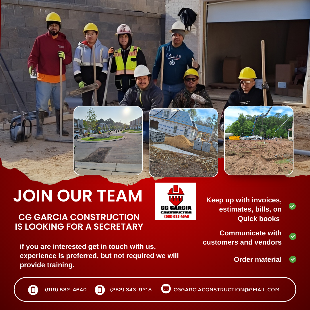#ConstructionJobs #NowHiring #SecretaryJob #CGGarciaConstruction #JoinOurTeam #ConstructionLife #JobOpportunity #ZebulonNC